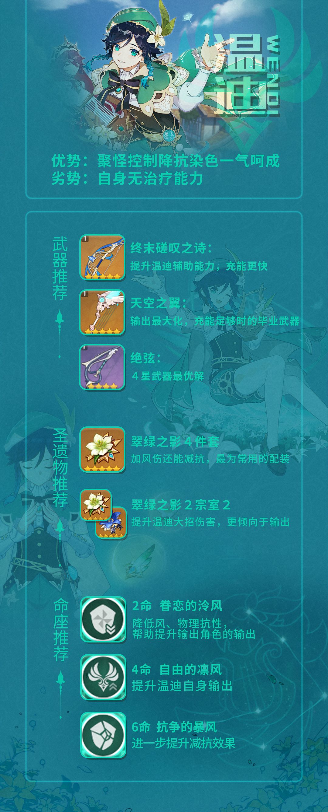 天空之翼的输出是最高的,终末可以认为是牺牲了温迪的输出能力提升了辅助能力,在队伍里其他角色配合得当的情况下队伍的整体输出能力提升也是比较可观的。阿莫斯之弓和温迪并不搭,其主要价值还是五星的高面板;绝弦是四星中最推荐的武器,其技能和温迪很搭配,精炼越高越好,高精炼的绝弦表现比阿莫斯之弓要好。如果没有绝弦的话可以考虑携带苍翠猎弓或者黑岩战弓过渡用,温迪基本不缺充能,西风猎弓的价值不大。
