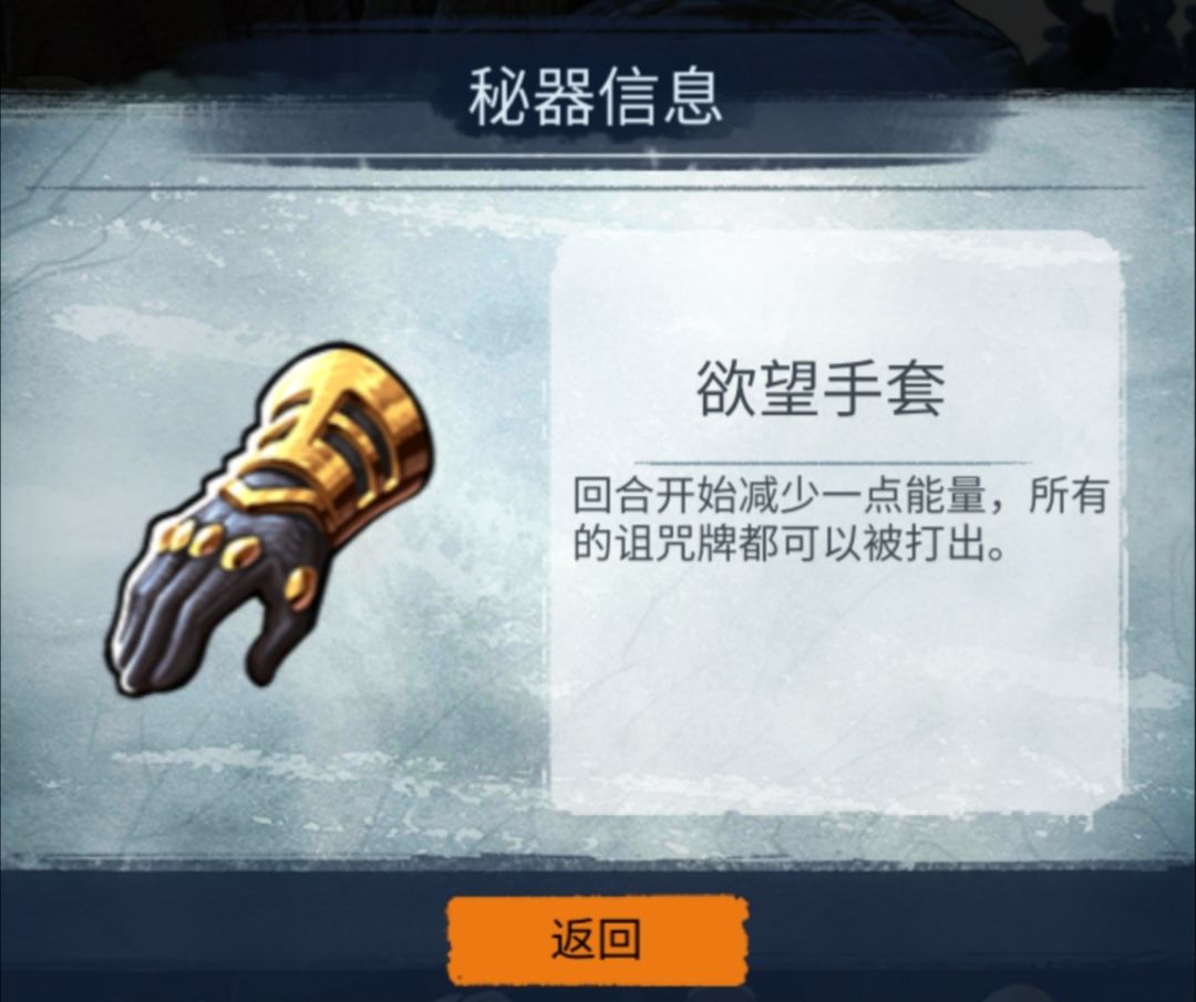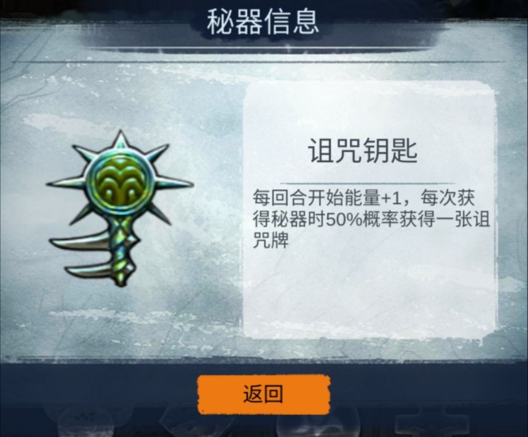 每回合获一点能量,每获得秘器50%的概率得到一张诅咒牌的诅咒钥匙