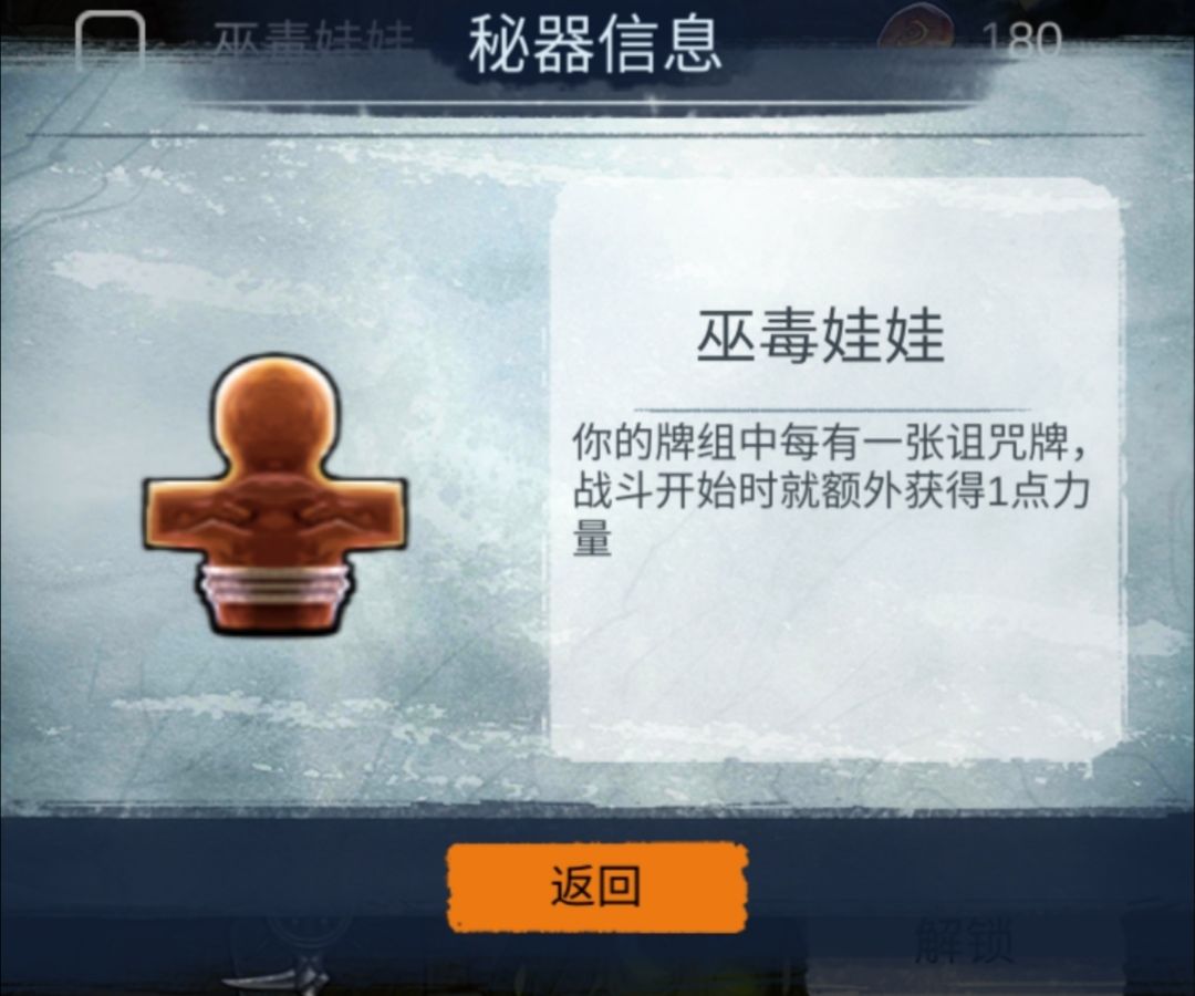 你的牌组中,每当有一张诅咒牌,战斗开始时就格外获得一点力量的巫毒娃娃。