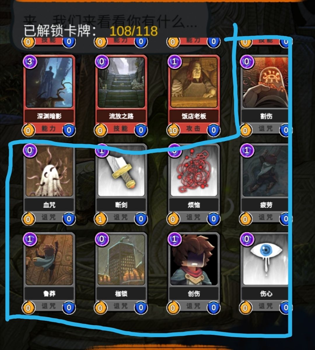 没错,就两张。你可能会认为是随机诅咒牌。烦恼、断剑什么,但是我告诉你是割伤还有枷锁。众所周知,剧情模式你怎么重新战斗还是开头那几张牌,只是五张牌换了顺序。但深渊模式你重新战斗,就是洗了一次牌了,所以你每次重新开始看一下你的抽牌堆你就发现那两张诅咒牌是割伤、枷锁。