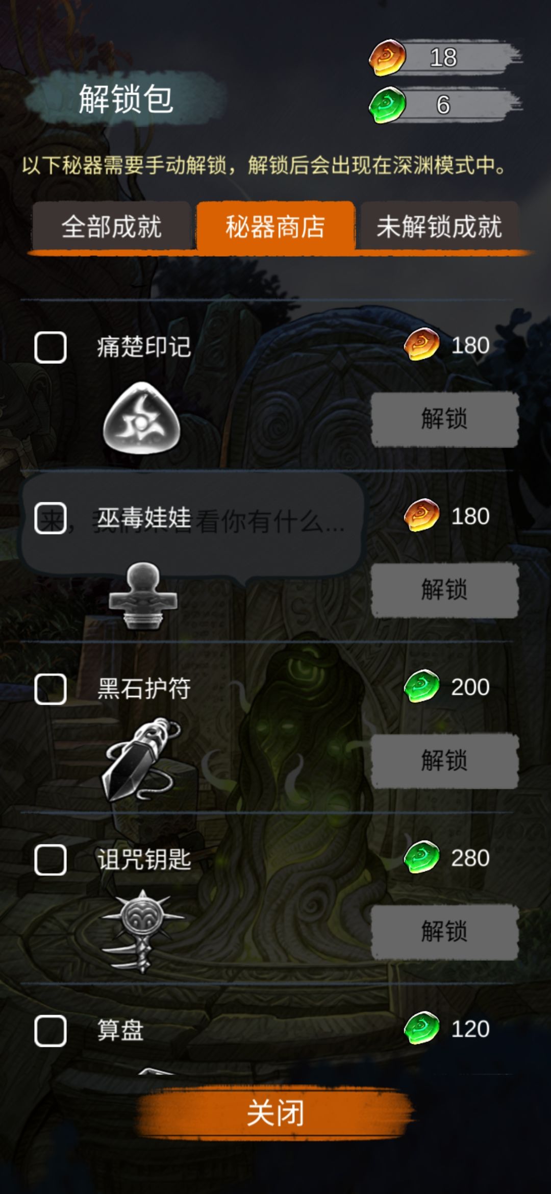 在上方所讲到的秘器中巫毒娃娃、黑石护符、诅咒钥匙要通过秘器商店进行解锁。