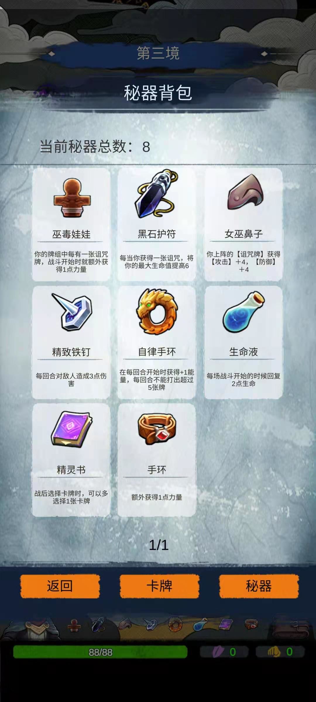 女巫鼻子是一个化诅咒牌变废为宝的关键秘器,因为秘境效果,肯定会有很多诅咒卡,所以这张卡的4攻4防就能让诅咒牌打出来并起到不错的效果。当然如果碰到那种不能被打出的诅咒牌那我就还是建议将其丢弃掉了,尤其是枷锁这张卡,既不能被打出又限制卡牌使用数量,遇到商店之后强烈建议丢掉它。