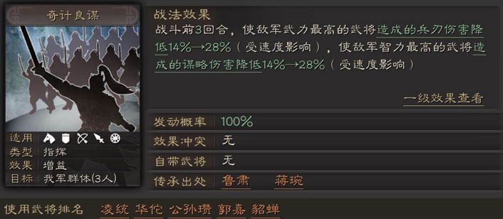 奇计良谋的效果与传统减伤并不相同,是对敌方武力最高的减兵刃输出、敌方智力最高减的谋略输出,有十足的针对性。