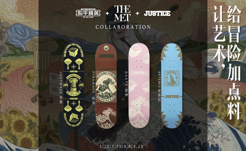 如今,《和平精英》x大都会艺术博物馆围绕联名双IP,还与新潮酷派的专业滑板品牌“Justice”推出系列联名滑板,可谓惊喜不断。