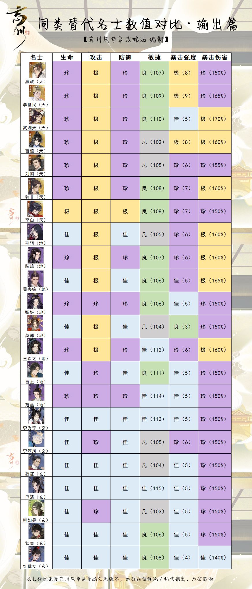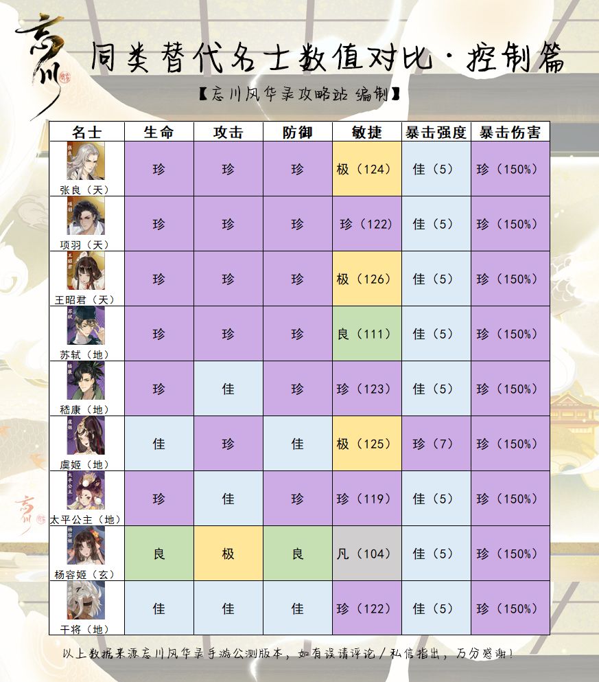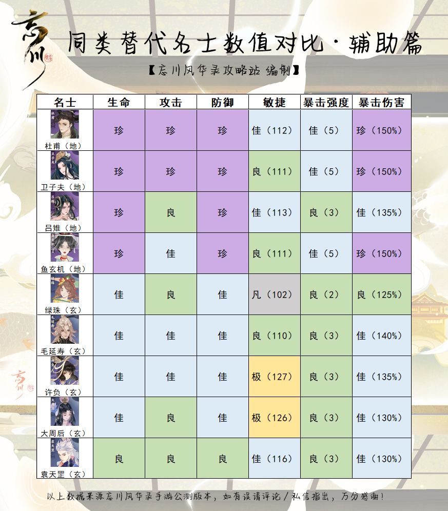 每位名士都有自己天生的面板,其中敏捷(也就是速度)决定了名士的出手顺序,而暴击强度、暴击伤害、攻击决定了名士的输出能力,攻略站在这里为大家搜集了全忘川名士(除黄级)的成长面板,喜欢对比分析的使君可以进来看看!
