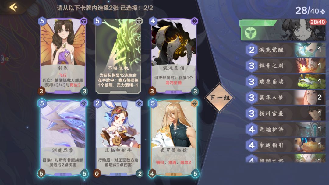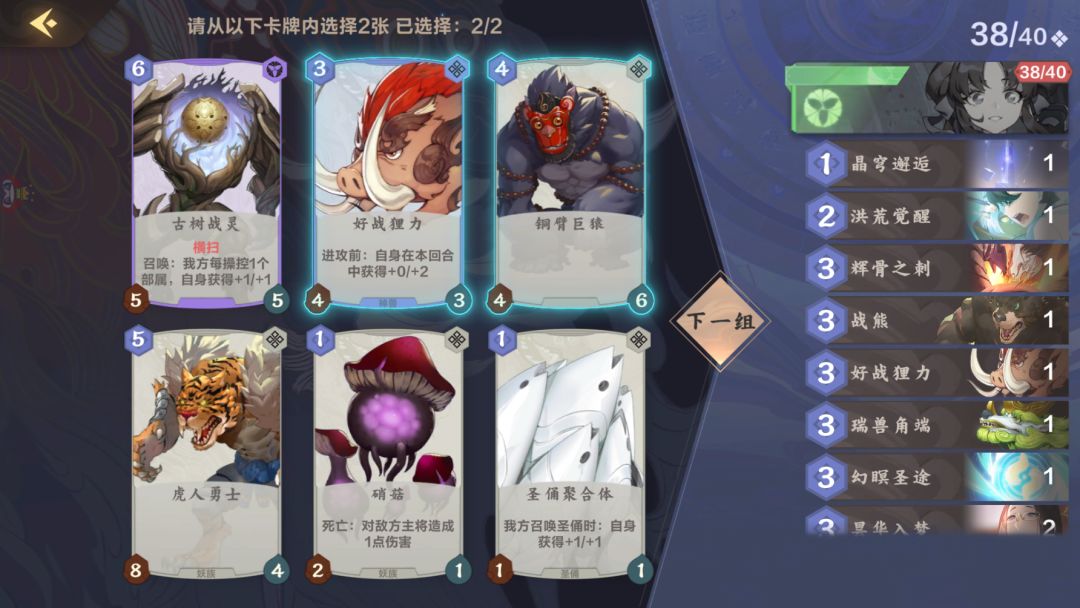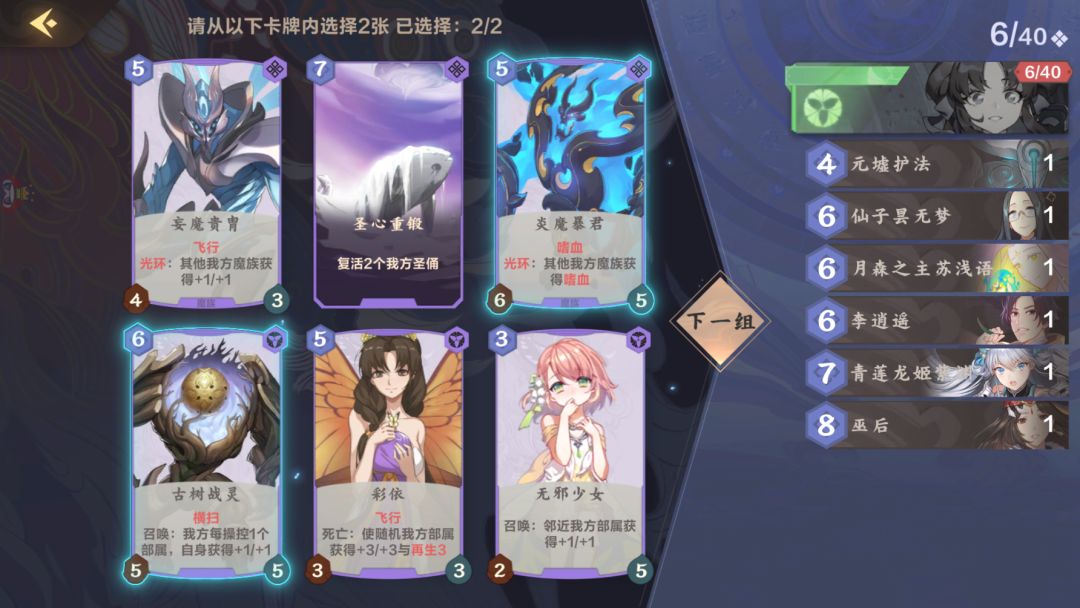 第三抓,这没什么好犹豫的,巫后+元虚护法,其实苍龙也是好牌,可以AOE清场,但是我想了想还是拿了元虚护法,因为复活木前期很需要费用。