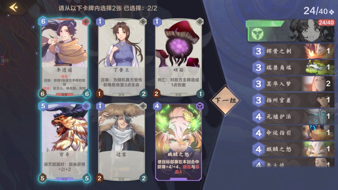 第二抓,师傅和酒剑仙还有苏浅语都是好牌,师傅是必选的牌,剩下这张这里我选择了苏浅语,酒剑仙固然不错,但是苏浅语可以配合龙女,所以这手我选了师傅和苏浅语,只能含泪跟酒剑仙说拜拜了、