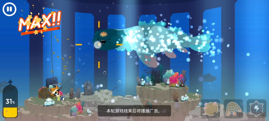 由于其多重鱼枪的特性,所以达到并保持MAX状态很容易,对近距离目标的伤害也较为可观,所以个人认为其很适合当中期过渡的鱼枪。如上图,在打完青枪鱼弹尽粮绝的情况下依然能击杀最后的两条独角鲸。