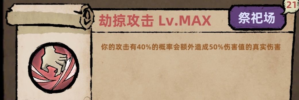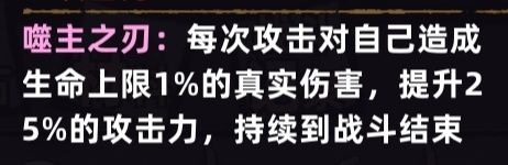 技能解析: 开局第一波扣除生命,提升3.5%最大生命值的攻击力。虽然开局掉一点血,这都不是问题,主要是能加攻击力,物理流的不二之选。