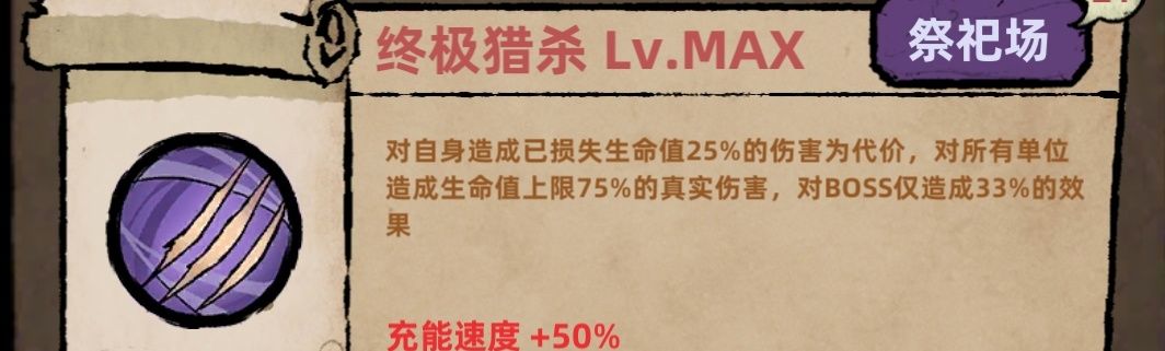技能解析:掉25%的血量,对所有怪物造成75%生命值的真实伤害,对boss仅有33%的效果。