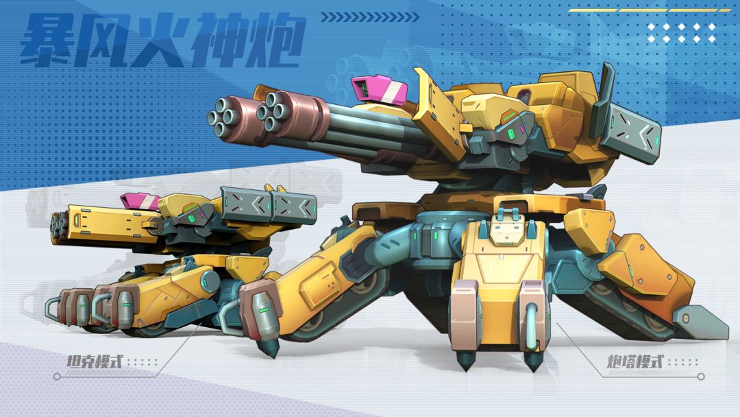 1.形态转换:停止移动1s后,暴风火神炮会从坦克形态切换为炮台模式,炮台模式所有伤害均会大幅提高(包括驾驶员伤害)。
