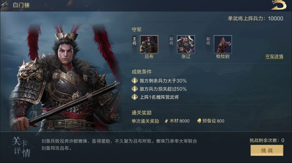 敌方阵容:主将 吕布(骑兵4000兵力),张辽(骑兵4000兵力),枪校尉(枪兵4000兵力)
