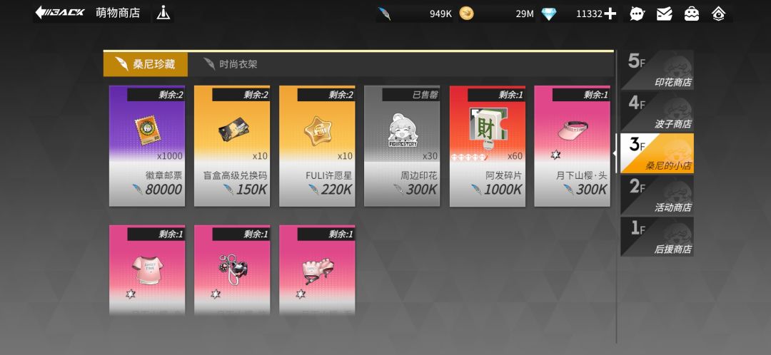 回收商店:升级满5个Lv220的手办以后才会开启,此时[四叶草贴纸]和[徽章邮票]成为废品,无需特意收集了。买得起什么,就买什么。