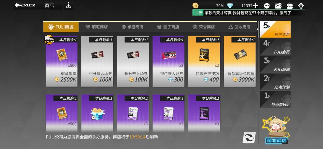 FULI商城:前期有钱就买金币价的[邮票徽章]、[盲盒高级兑换码],中后期只买[积分赛入场券]、[高级养护]。