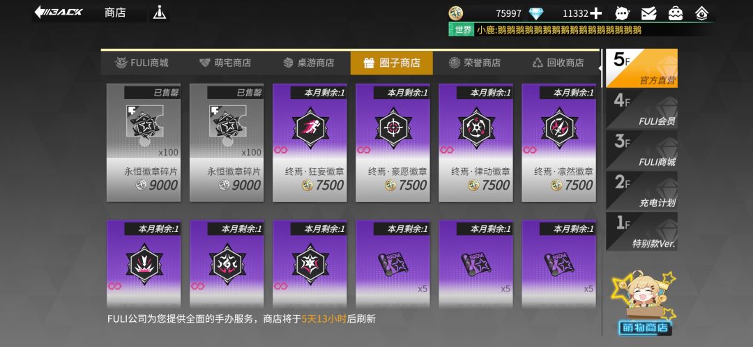 荣誉商店:购买[FULI周年纪念章],后期突破[不朽]和[永恒]徽章必备,紧急情况下可以买[FULI许愿星](比如这次的应援棒活动要用到)。