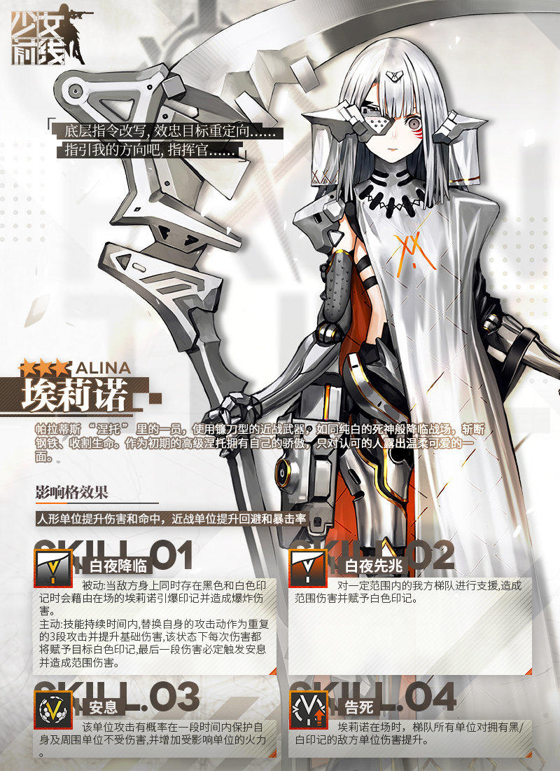 帕拉蒂斯“涅托”里的一员,使用镰刀型的近战武器,如同纯白的死神般降临战场,斩断钢铁、收割生命。作为初期的高级涅托拥有自己的骄傲,只对认可的人露出温柔可爱的一面。