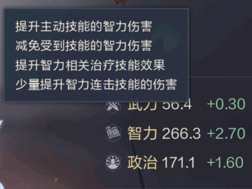 智力主要影响了以下几种伤害:全部智力主动武技伤害,全部智力连击武技伤害,白旄军单次平a伤害,全部智力指挥武技伤害,全部智力被动武技伤害,并且智力属性直接负责防御敌方所有智力伤害