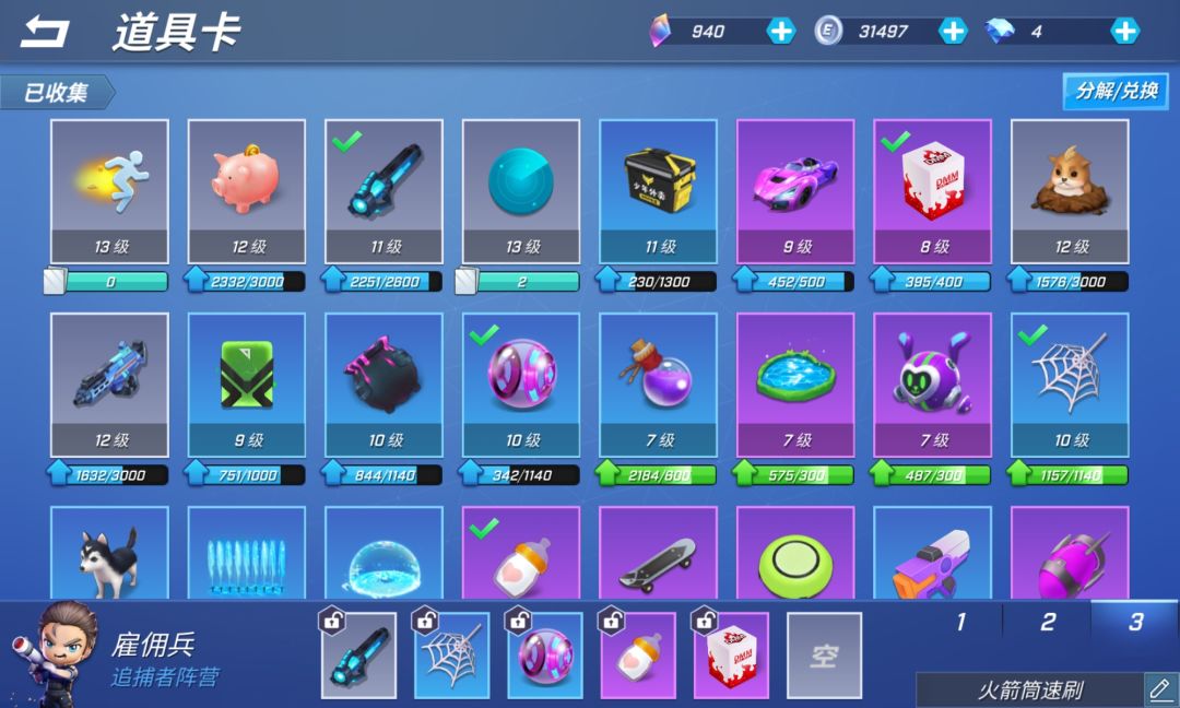 自走球(可以换成疾跑或者战术捣弹,皮卡)这个主要是加速道具。