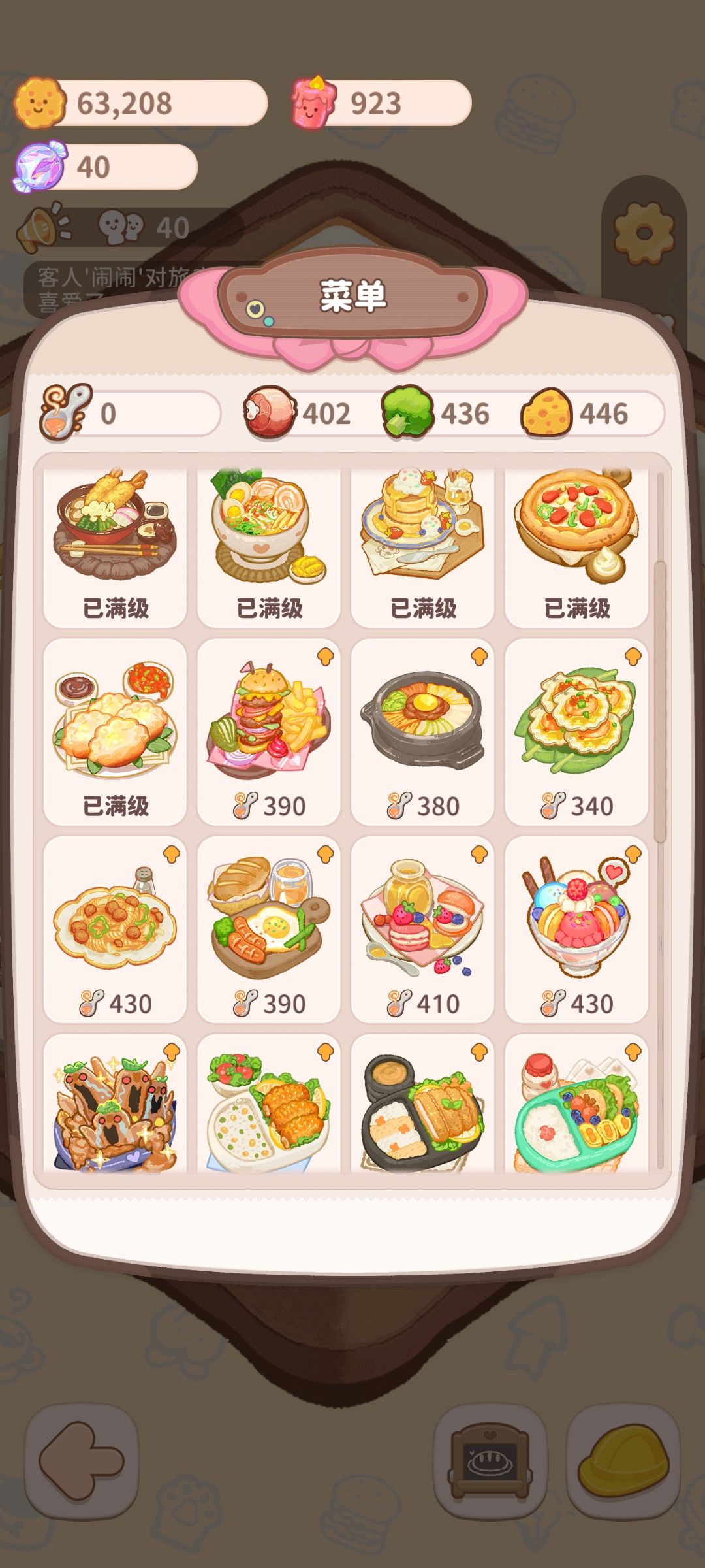 菜单前几个第一级不提高人气,之后的升级到第二级提高一个人气,第三极就是满级,升到第三级提高两个人气。升级同时会提高价格,也就是饼干(可用于买家具)数量