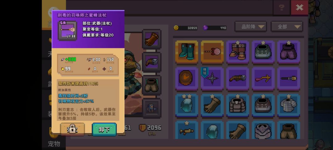我们召唤流的装备搭配估计是唯一一个对武器本体没啥要求的流派,要求就一点,有召唤物攻击这个词条,只要有这个词条,不管是蓝装还是绿装,只管带就行了。(有些绿装有召唤物攻击+35%以上就是比橙装还好的极品装备)