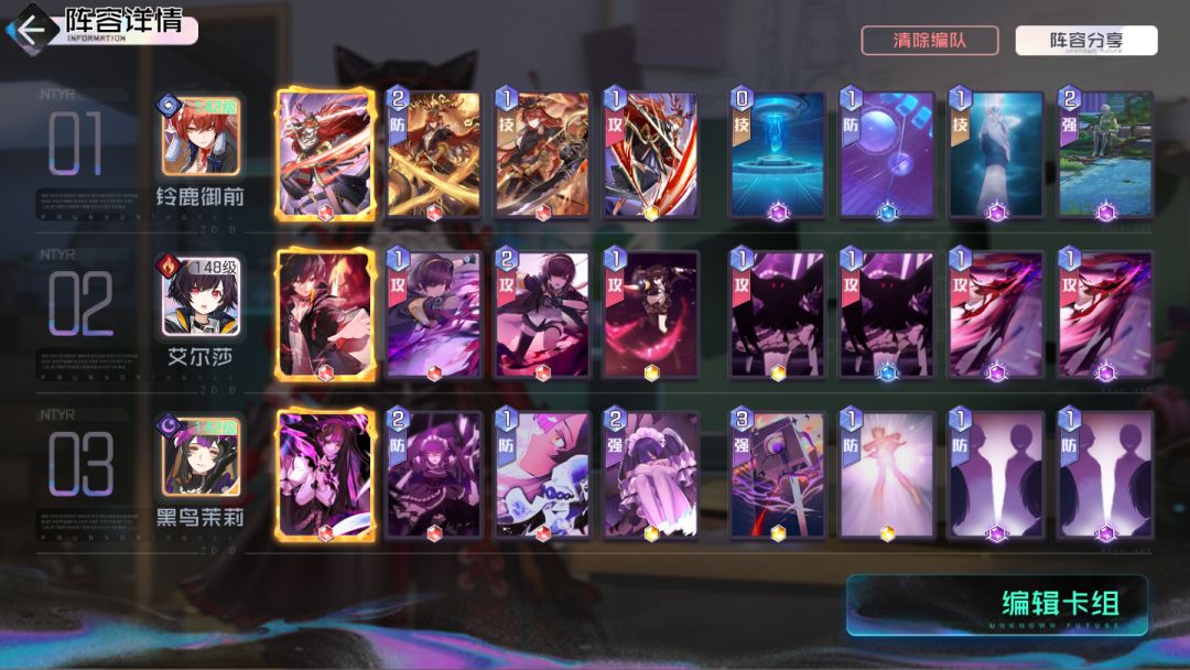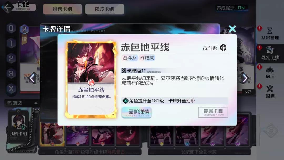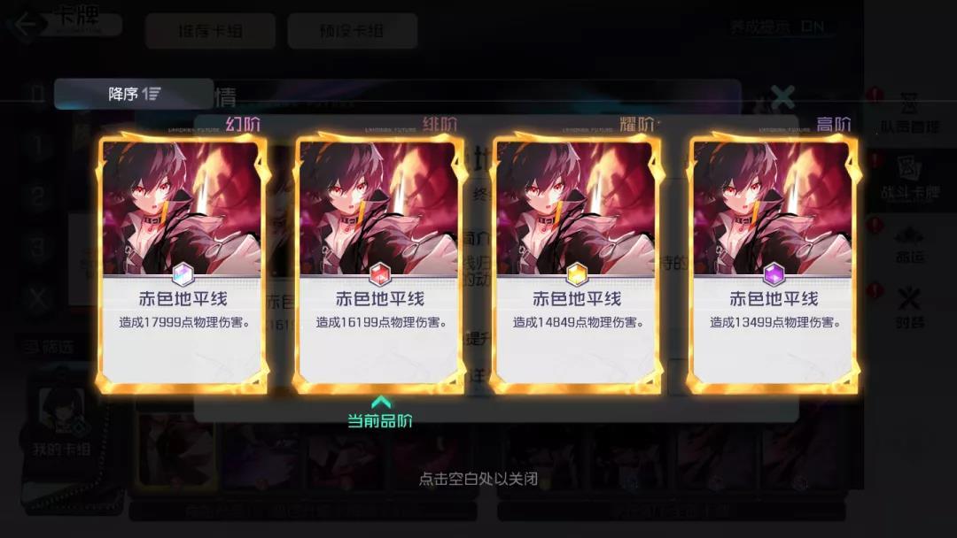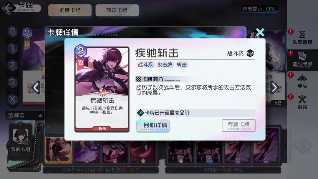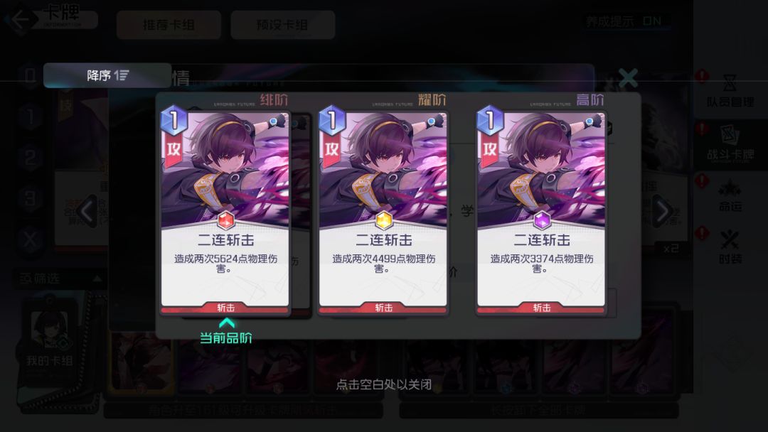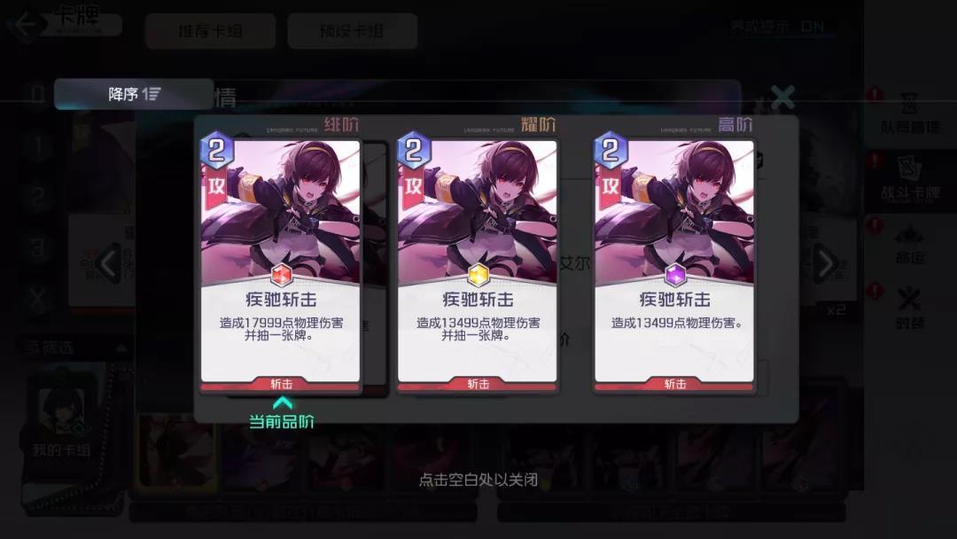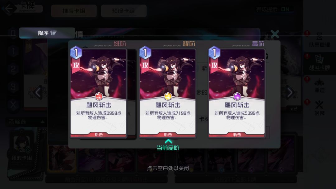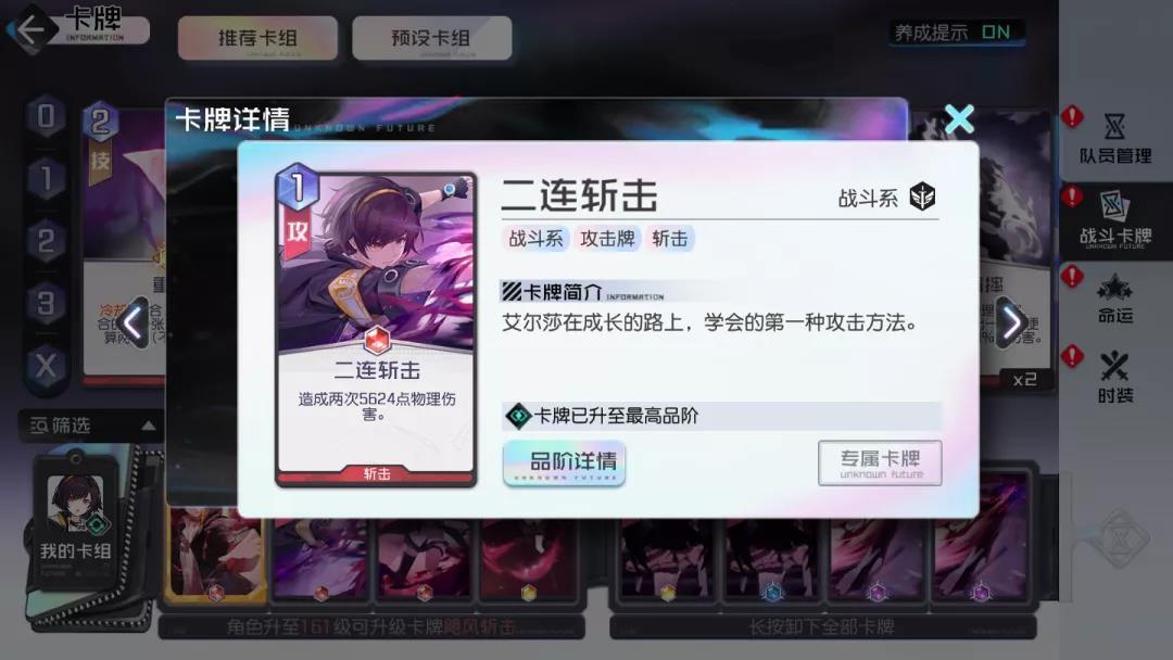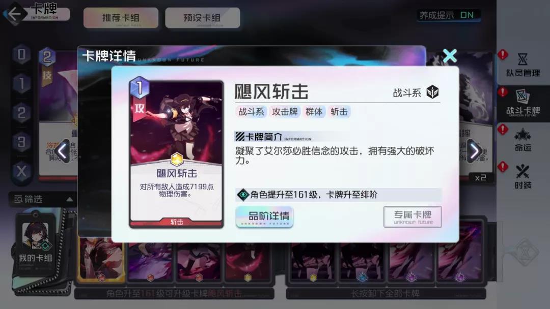 斩击类卡牌(享受斩击精通带来的加成效果),抽牌并没有限定队伍中的某个角色位置或者某张特定牌,所以个人认为意义不是特别大,特别在世界线关卡能耗本来就已经非常紧张了。在允许的情况下,攻略君会选择2张1费的攻击牌去打伤害。