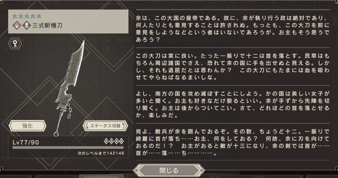 这把大刀真是好用啊,轻轻一挥就能斩下十二个脑袋。周边各国都因为这把刀而恐惧,不敢对我的国家出手。但是,你不觉得这样也很憋屈吗?我必须每次在使用这把大刀之前让它吸食足够的血。