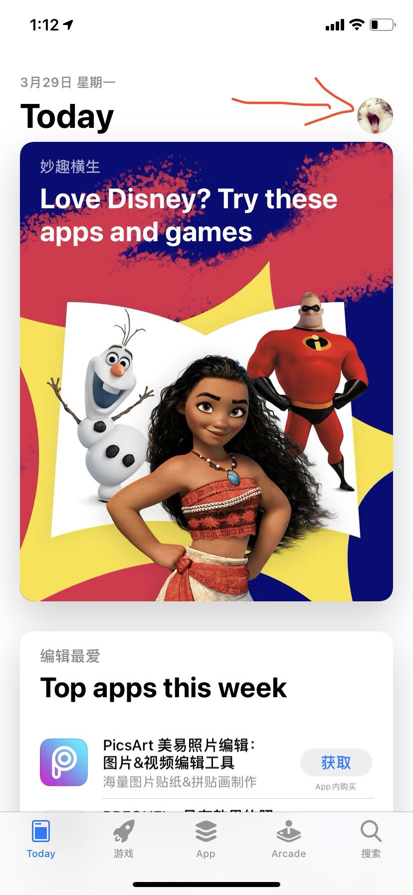 首先打开app store应用商店,点击右上角头像