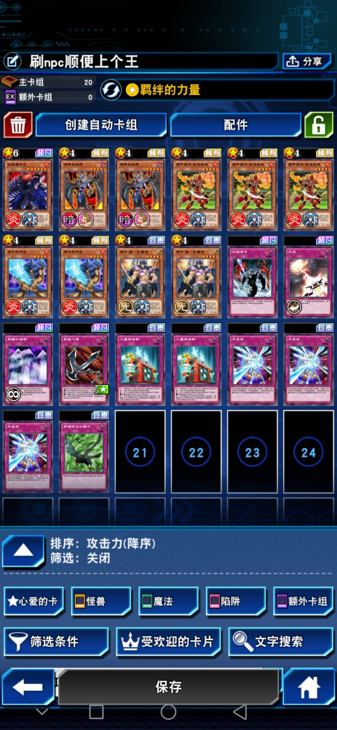 接下来说下这套卡组的上王思路,不要主动攻击,不要主动攻击,不要主动攻击。除非对面没陷阱卡。然后这属于半阴间卡组吧|•'-'•)و✧。一般没人能忍的住攻击力比对面高,还怪也不少的情况下不打。然后这套卡组就是利用这个心理,陷阱卡怼他。经常碰到对面白龙,阳炎,真红眼等等,对面发过来他就会体验快乐