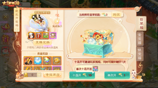 玩家每次开启翡翠宝箱均有几率掉落至臻如意丹,可用于兑换绝版鎏金群攻珍宠——龙兔,绝版典藏时装——锦年,养育主题双场景演绎随身特效——两小无猜及养育空间装扮,还有几率掉落五常神兽及超级元气丹等稀世珍宝!首次十连开箱还将得到全新个性队标——童真!一定不要错过!