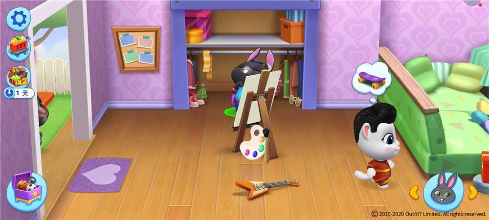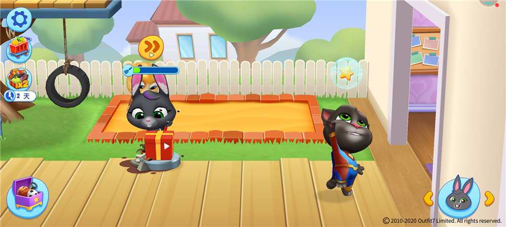 《汤姆猫总动员》游戏玩法上依然是遵循入手低门槛,和主打休闲益智的路线。游戏场景在室外设置了前、后两个院子分别实现农耕外出和运动的功能。室内设置了带有大浴缸的厕所,客厅里拥有开放式厨房、沙发群、和足够大的衣柜,玩具箱内丰富有趣的道具,可以在场景内随意拖动和摆放,并且关联到各内置小游戏。