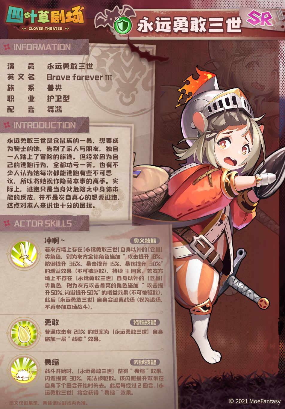 永远勇敢三世是仓鼠族的一员,想要成为骑士的她,告别了家人与朋友,独自一人踏上了冒险的旅途。但经常因为自己的逃跑行为,全都功亏一篑。也有不少人认为她每次都能逃跑有些不可思议,所以将她视作隐藏本事的高手。实际上,逃跑只是当身处危险之中身体本能的反应,并不是发自真心的想要逃跑,这点对本人来说也十分的困扰。