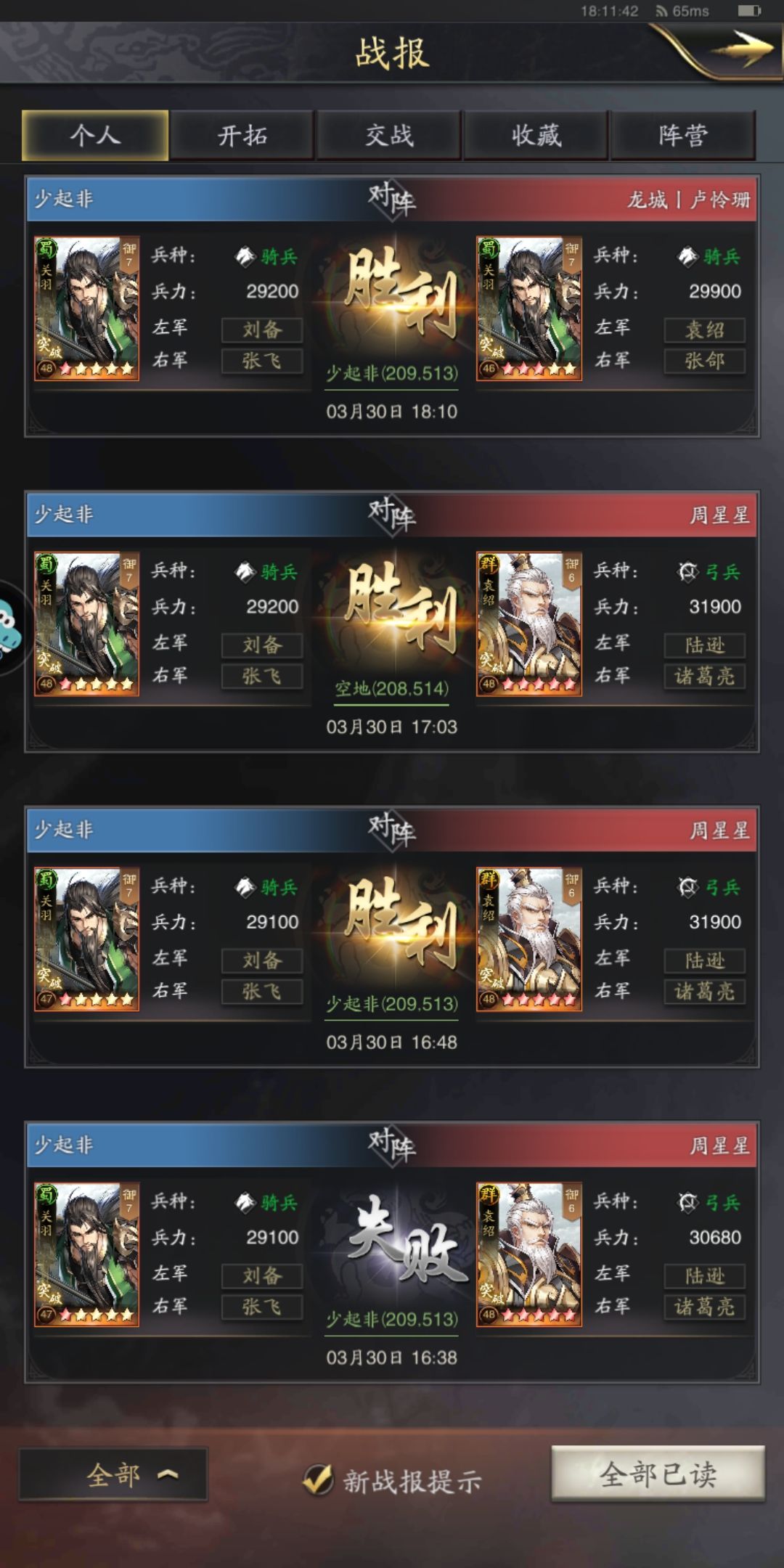 在补三张,这三张是我买的小号玩儿的。他这个之前走的大众桃园路线,遇上三势就被无损虐。看我改成关羽主的效果。实际上不管三势陆换成什么技能 ,只要张飞开局不被秒,关羽头上没控制,这局基本上稳了。这个区的比武就遇到一次三势陆,也一样打赢了,而且是没有虎豹骑和一鼓作气。算是个低配。