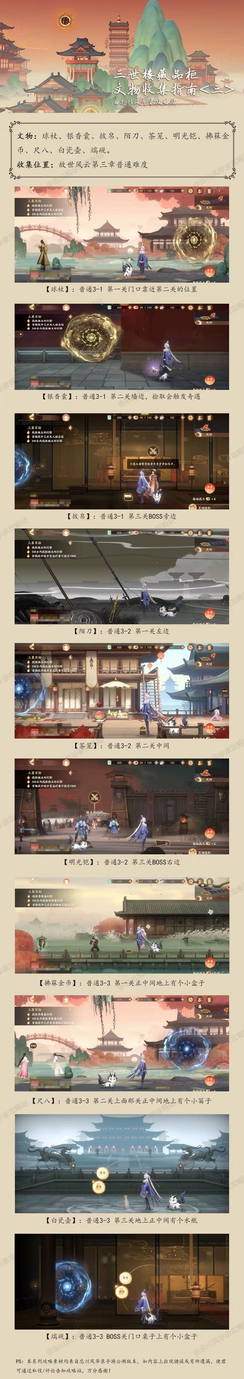 故世风云可拾取道具系列攻略目前已经施工完毕,1-6章都给大家整理好放在这里了,里面包含各种奇遇、文物拾取各种奖励,如果之前一直没捡的使君可以点进来一次性捡完;捡过的使君也可以进来查漏补缺,看看有没有落下什么!