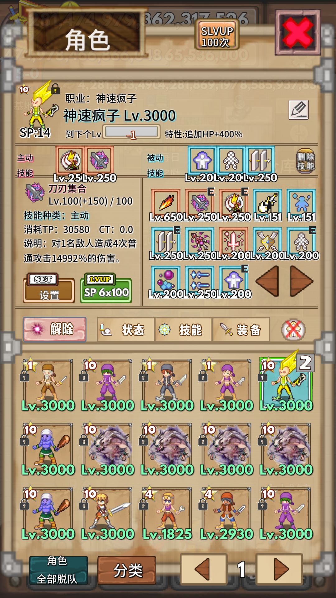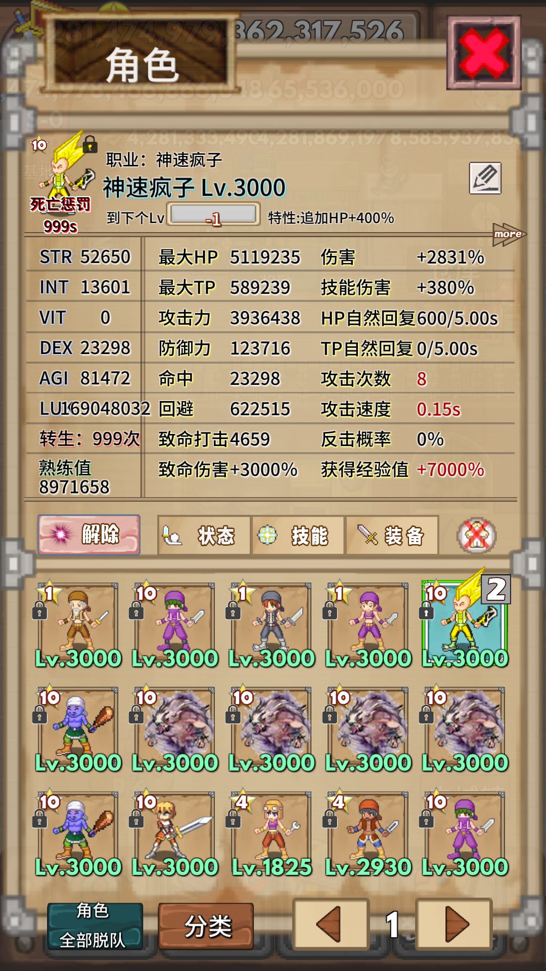 图一是属性,普攻一刀1.5亿左右,图四的技能能打4.5亿,但是图三那个也能打4.5亿,如果攻击力低点的话效果应该会更好,而且开个连点器一直点技能,效率还是挺高的。