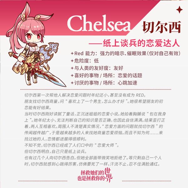 「没有哪个女生不知道恋爱大师切尔西!她懂得恋爱的甘酸,理解我们的一切心情!你遇到恋爱上的问题,也去找切尔西商量吧。她转眼间就会为你解决的!」