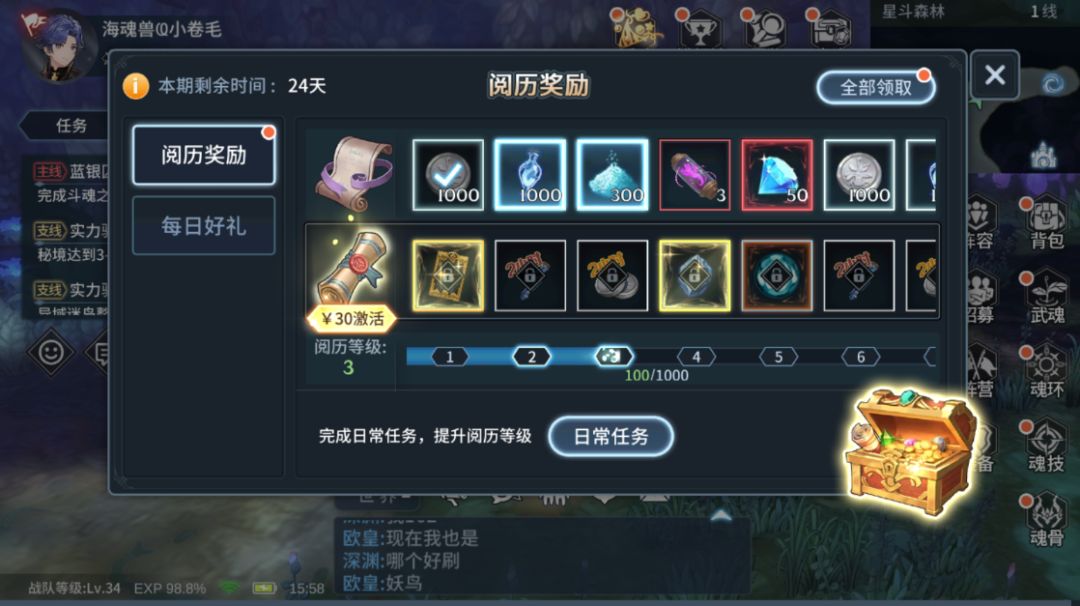 说要白嫖,那就白嫖到底,阅历奖励分为普通和高级部分,高级需要30元解锁,普通部分通过每日和每周任务即可解锁奖励,奖励里也有钻石哦~千万不要错过~