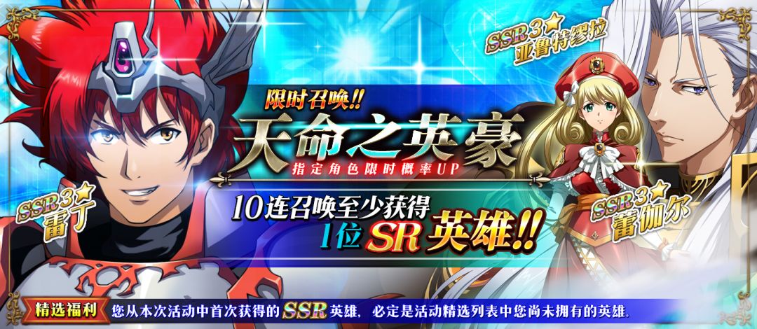限时召唤「天命之英豪」中SSR级英雄雷丁、亚鲁特缪拉、蕾伽尔出现概率提升!