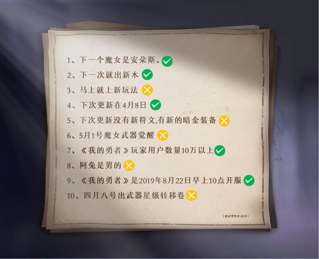 一年一度的愚人节节来临了,但是在愚人节前夕,勇者城中居然出现了一些不知真假的小道消息,有细心的勇者经过调查居然发现......是阿兔!阿兔最近除了卖货居然也做起了情报生意,但是年轻的阿兔好像不知社会的险恶,貌似买到的情报中混杂了一些假消息,本来大家以为阿兔会亏一笔金币,但是阿兔居然把这些情报打包一起卖给了勇者们......看来,只能勇者们自己分辨消息的真假了。