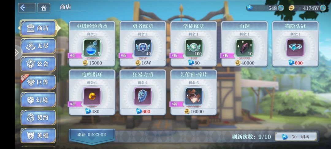 剩下的可以优先购买破光弓,诅咒弓,混沌天使系列,至于商城篇的几个产出,如果在幻境出现,除非自己实在没有的情况下,不然都不建议拿幻境币购买守护戒,能量头,黑山羊等。