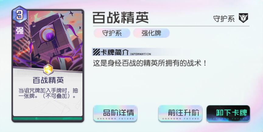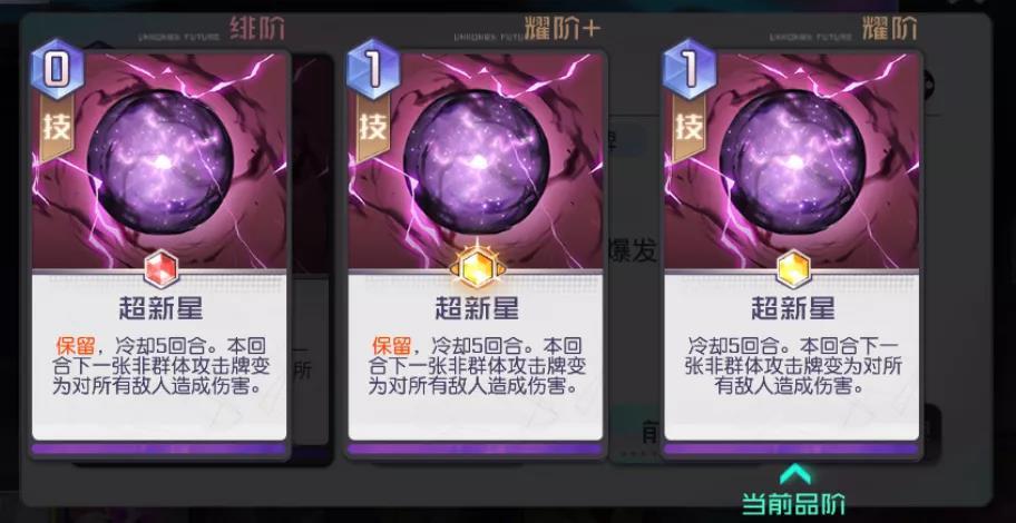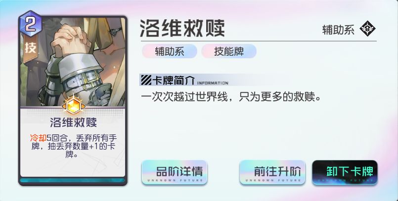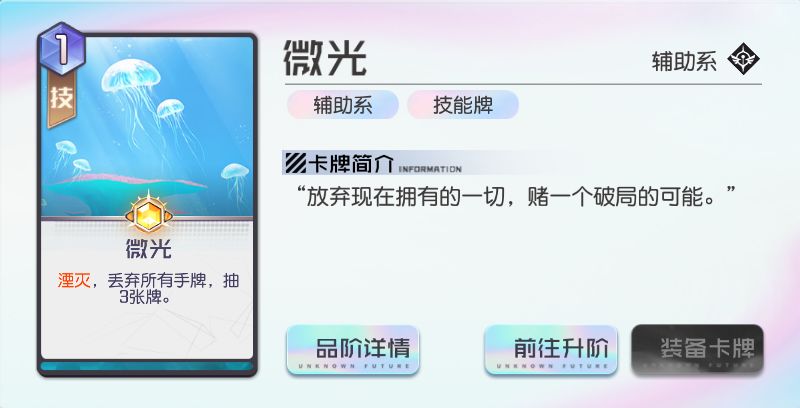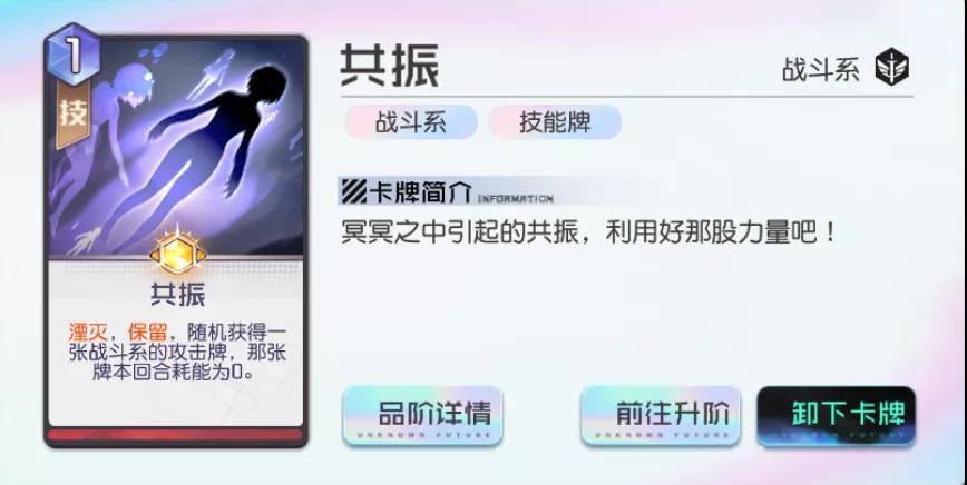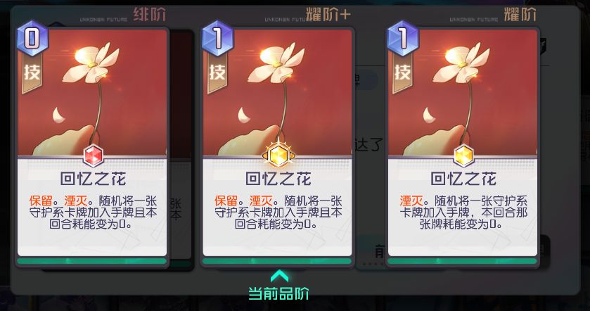 因为其手牌没有湮灭属性,所以非常适合与一些特定的卡牌搭配,比如【授君以花】、【粒子波动】等可以复制手牌的卡牌,将这些低攻击手牌丢弃去重新抽有用的手牌,当然是耀阶+以上的最好了。