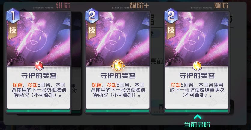 耀阶+的保留属性还是非常可的,特别是遇到那些伤害巨高的BOSS,在防护牌紧缺的时刻可以扮演重要角色,一般搭配守护系一些角色自带牌扮演群盾*2的角色。