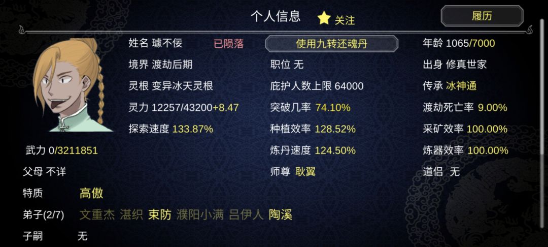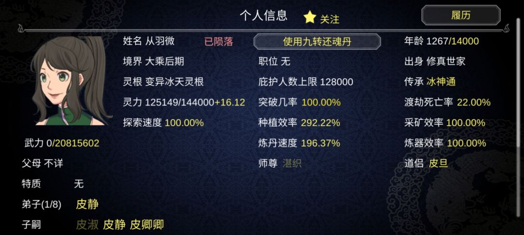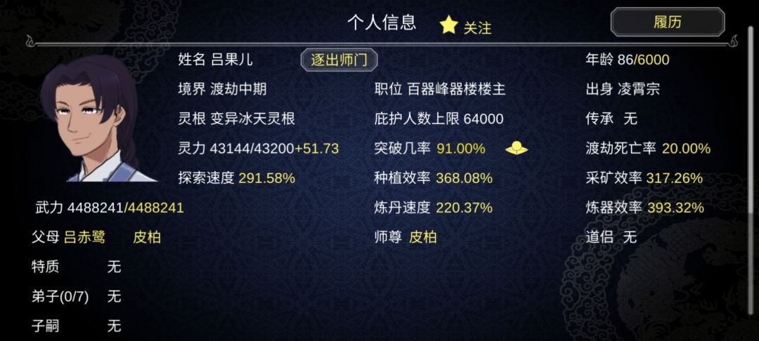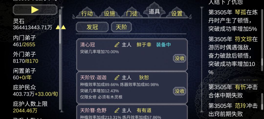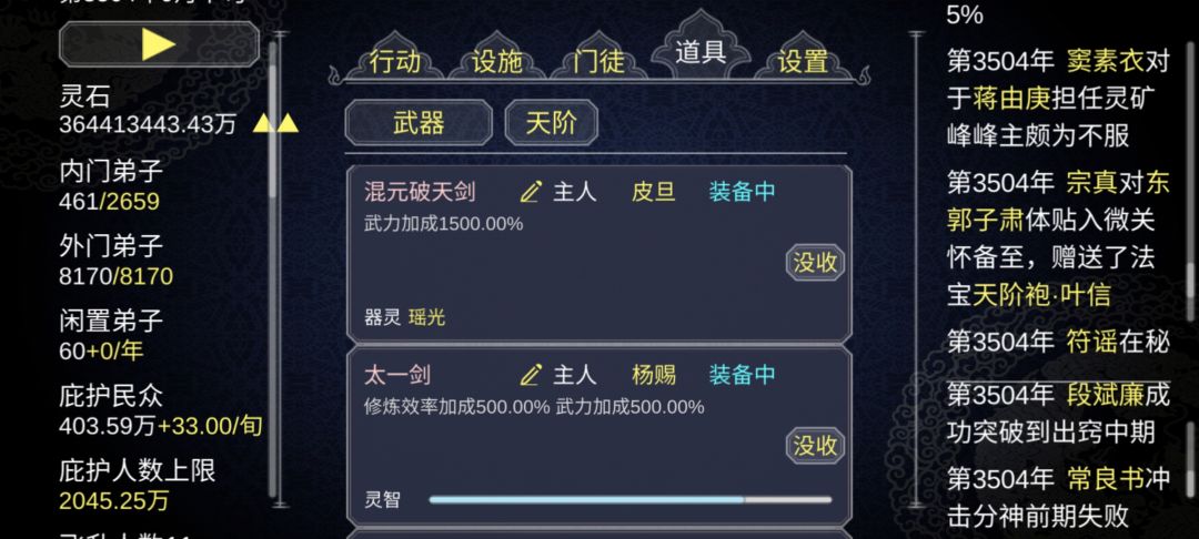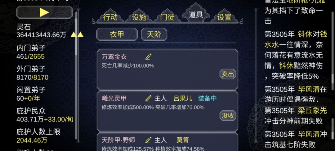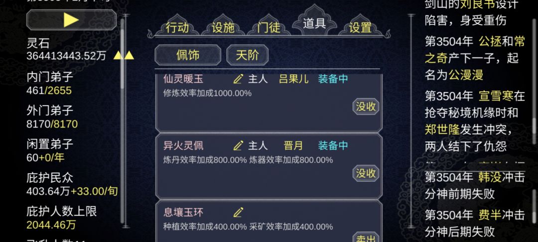 最后要说的是,收弟子多少的问题,有人建议走精英路线,少收弟子,弄10个飞升就好了内门弟子也尽量少,有人联系大量收,我说说我的看法吧,其实我还是倾向于大量收弟子,首先,装备的属性太杂,你要整理出十大弟子的优秀装备也不是很简单,而且突破率不是100的话有陨落或失败的可能,有人说吃药就行,但是那个炼丹的速度比较感人,我玩过两次大量收弟子的,大概3000年左右完成任务,其实速度不快,就是感觉爽,弟子渡劫期之前我都不喂药不给装备,除了他们自己带的然后有了一定量的药就选几个优秀的喂,然后好装备集中起来供他们快速飞升