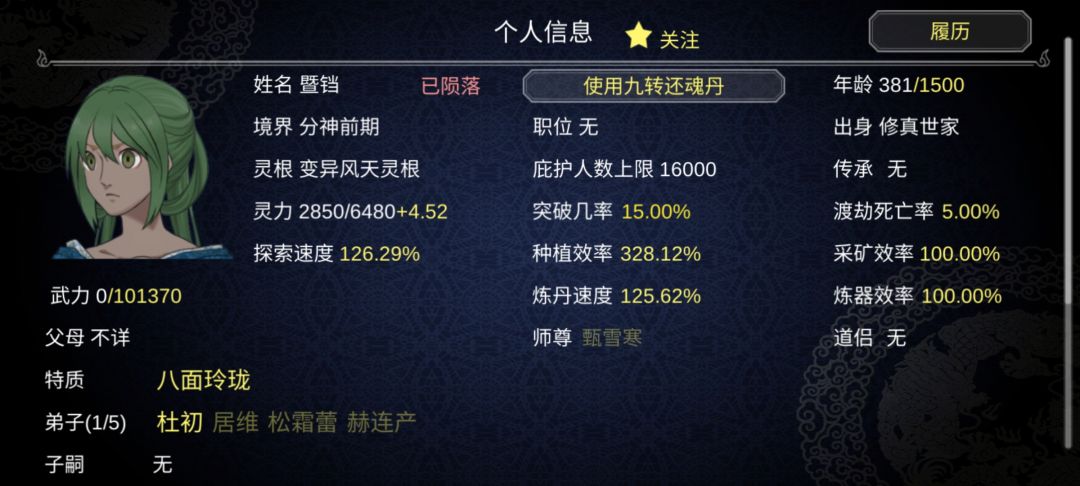 然后再用最好的装备去收弟子,无限循环,没有好装备就扒弟子的,等到你打到了地阶天阶装备,就会源源不断,变异天灵根弟子一大堆,天地阶装备一车一车的,到了这个时候宗门进入高速发展期,黄金时代已然来临
