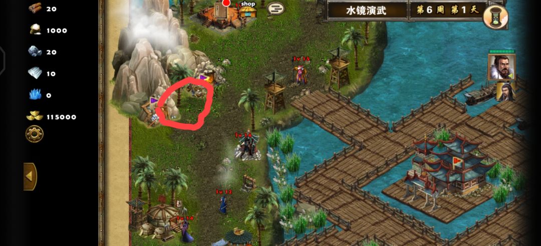 这两个红圈,小红圈处有一个技能“突袭”,消耗法力值,当前回合行动两次,并提高30%吸血。不拿的话会被周瑜拿走。大红圈是刷兵的地方,我见过的有:散仙、东吴水兵、无当飞军、象兵、虎卫、虎狼骑。每次游戏只会刷两种兵(一种每次16个,一种每次40个,有时候各4四组有时候三五分,我碰到过3组16的,5组40的),建议虎卫、无当飞军,一个能抗一个伤害高,且每组40个。右下角有一个玄武的召唤地,如果富裕,最后可以去召几个,最后一战用来冻一下司马徽,前面召了没用,几下就打没了。