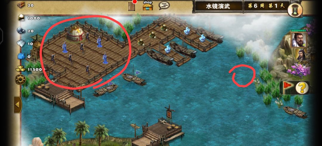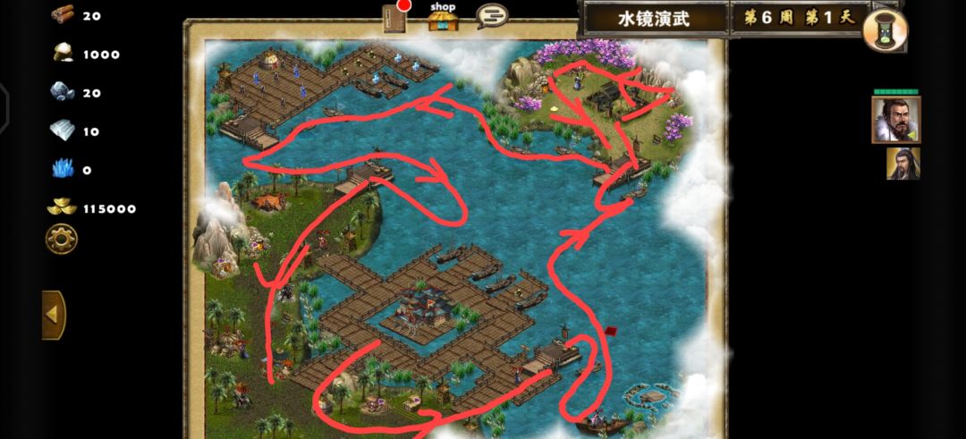 跑动如图,这样跑完大致一周以内,然后就开始打架了。每周把兵站的兵都招了,资源够的,兵站不需要建造,所有招兵的都是满级的,海上资源捡一些金钱。然后这个建议用红法,主抗伤,附带打一点点伤害。神射不要升鹰卫,一共都没几个。