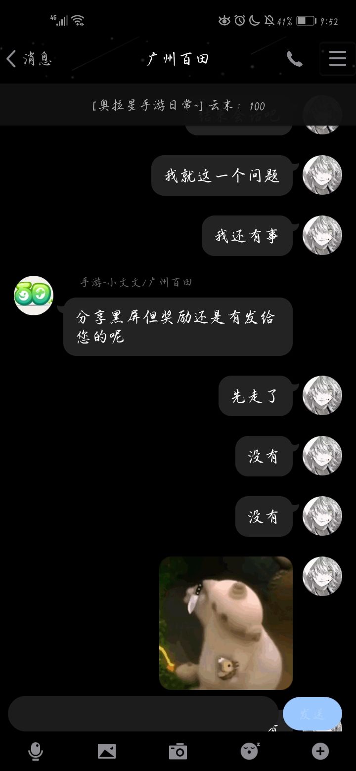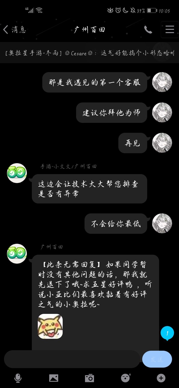 最后说了不会给他最低的差评,秒回了我个自动回复(意思就是他看见我不会给他最低的评分秒退了会话)