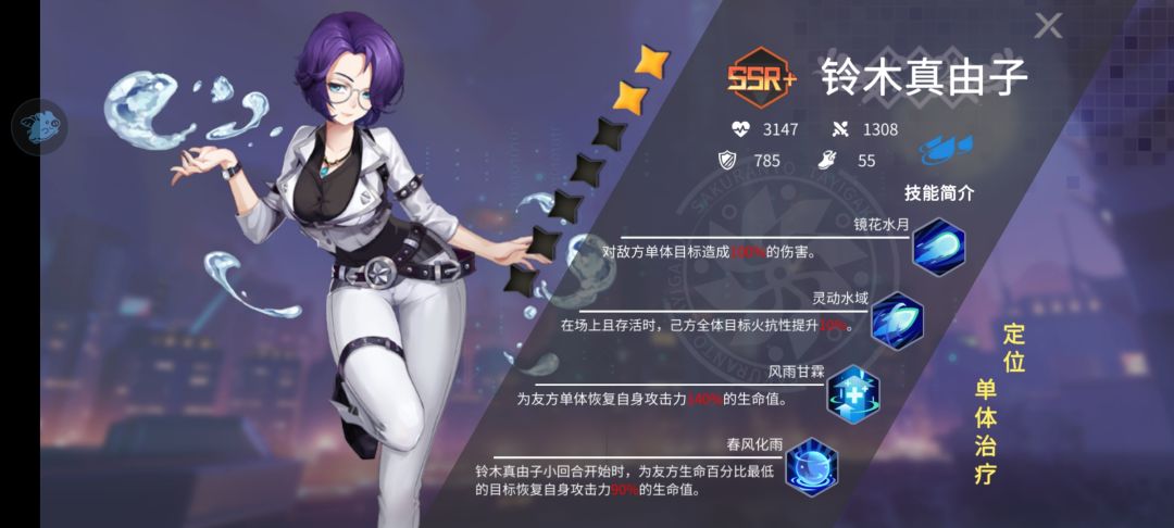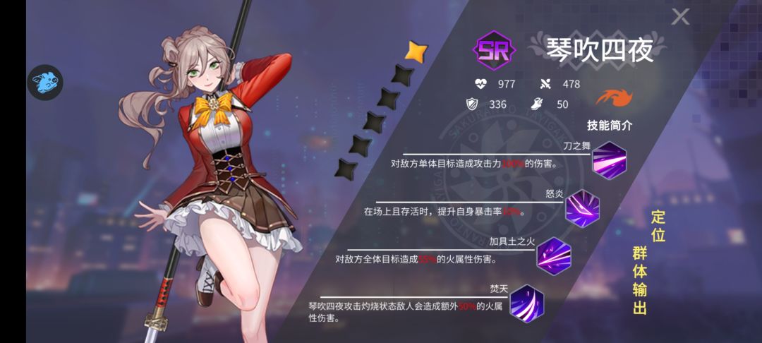 曾经尝试过配合SR的琴吹四夜,她的技能对于有灼烧的目标附带额外伤害。后来发现ssr和sr的属性差别过大,琴吹完全在刮痧,这里就是游戏设计不合理的点,SR完全无用武之地,永远无法取代ssr,前期可以用sr的几个辅助和肉,然后就永远上不了场了。这里提醒千万别养sr,除非游戏改版。