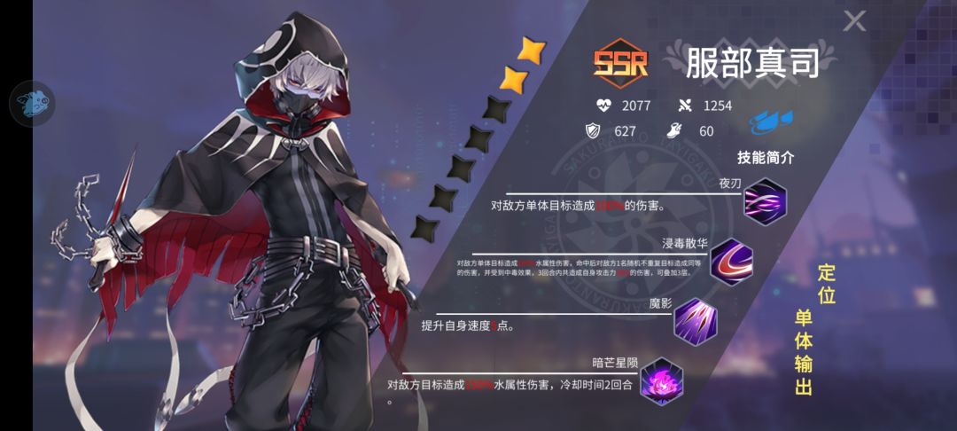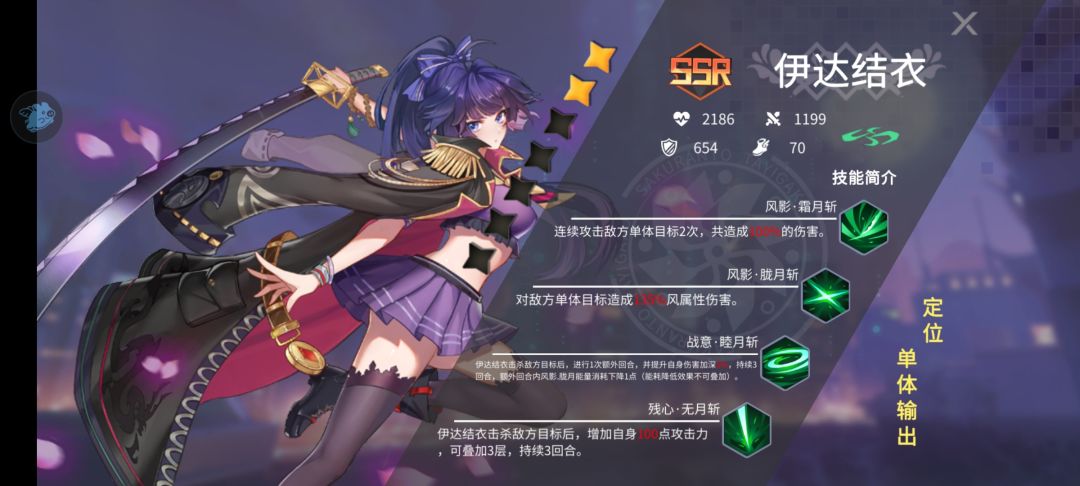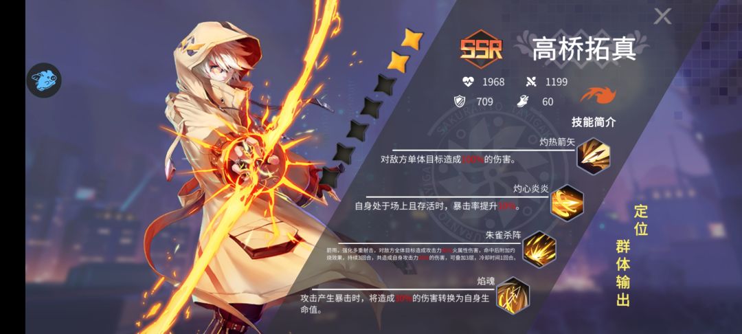 但是玩到第3天甚至是第2天,你就会发现她不过如此,这时候靠她单C推本已经比较吃力了,如果你所有资源都给她必然会面对关卡全1星的窘境,这是无法避免的。所以爽完第一天必须换C位,直接把她重生了(个人觉得有点狠)。伊达结衣由于是单体输出,很难清动怪,所以强烈推荐主C高桥拓真。他的团队输出是我个人认为目前最给力的。一开始不明显,但是随着提升他的3技能,他的优势就非常明显了,首先是群体附带灼烧,其次是目标有灼烧就增伤,这就表示给他一点辅助就爆炸。配合吸血不被秒杀就是满血。早日升到4星非常好推本。打目前伊达多的版本,火正好克风。