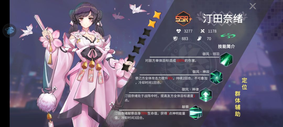 第三个辅助角色就是最近刚刚能换的神辅助汀田奈旭,本身ssr+就是高属性,被动群体加速更是竞技场的神,因为竞技场谁先动手谁基本就赢了(同级别),伤害永远是溢出的,因为资源有限,除非氪金多,不然只能养一到两个主要角色,很难养起第三个,所以其他角色脆的像张纸,基本一个AOE就能看出对面谁是主C了。汀田的群体加攻前期比那个固定加攻的sr加得少,但是越后期一定越强,而且群体加攻,等后面版本更新多出几个C位就会非常有用。觉醒技能直接就第二回合出神明了(正好第二回合星野觉醒CD中),这里可以配合很多英雄打神明目前我不敢说配合哪个神明厉害。