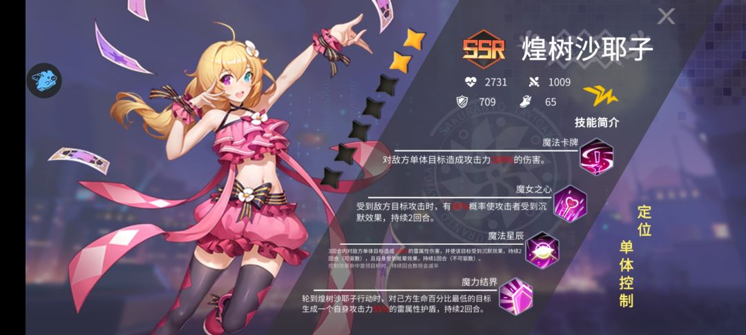 第二个辅助就是煌树沙椰子,这个角色我也非常爱用,因为她能强行废掉一个怪两回合,让它只能普攻,面对那种加属性的加群体盾的怪(而且比你的星野快),直接放弃打两轮AOE,先手沉默它。煌树的速度比西野快很多,看面板也能看出。而且她的被动偶尔也能沉默别人,也算是意外之喜,觉醒以后每回合给血最低的人盾也是非常不错的。觉醒以后稳定给盾也是极好的。